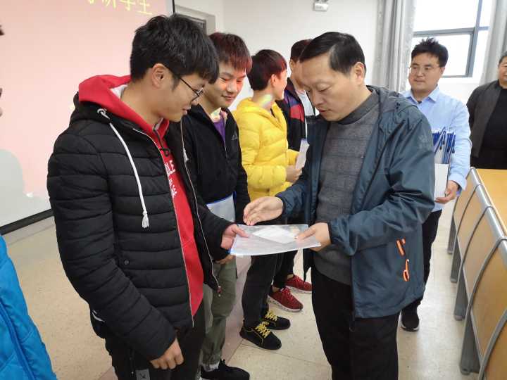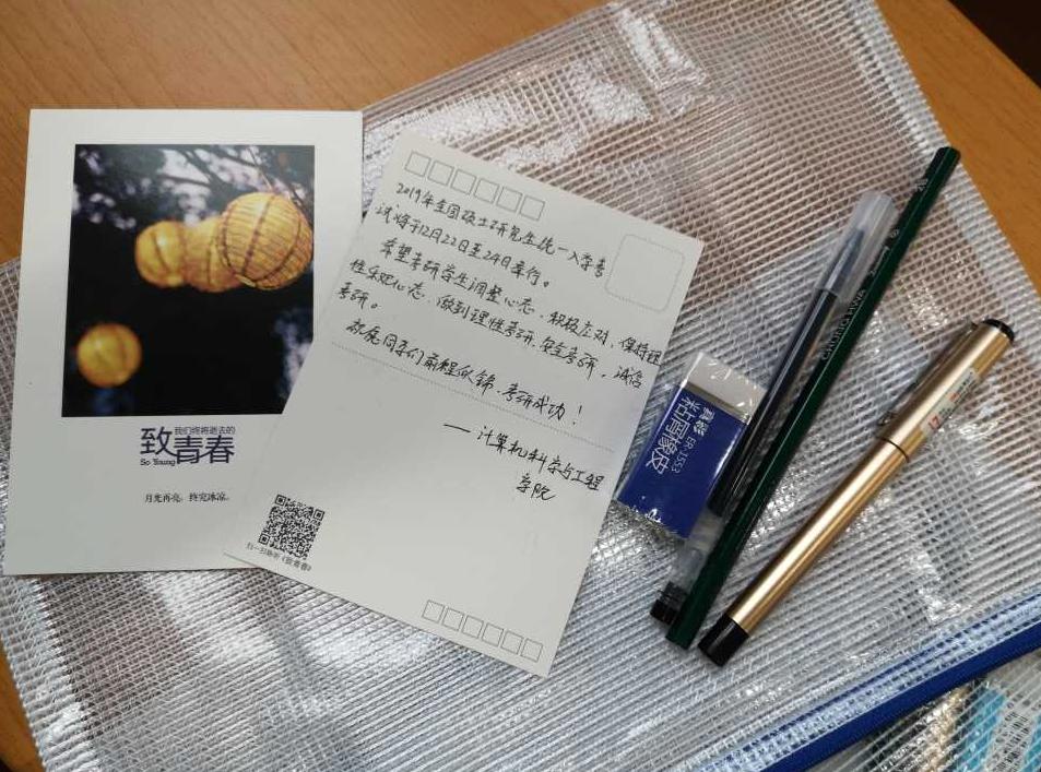 王永祥鼓励同学们在最后的二十天内积极准备,争取最后胜利。他强调这阶段心态和身体状况最重要,希望同学们调整心态,积极应对,加强体育锻炼,以积极进取的精神面貌迎接研究生考试。随后,学院领导对考研学生分发了笔袋、铅笔、水笔等考试用品,每个笔袋中均有一张来自学院的明信片,上面写满了学院领导和教师的希望和祝福,同学们深受感动。