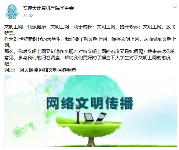9月18日,为贯彻国家主席在全国网络安全和信息化工作会议上的重要讲话精神,计算机学院积极配合,通过学院官方QQ“安理大计算机学院学生会”及官方微信“计科助手”在全院宣传并在各年级班级群中发布宣传公告,将本次宣传工作落到实处。