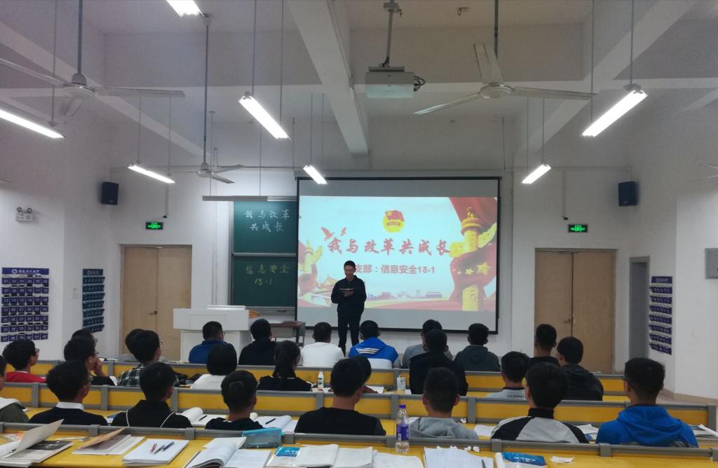 10月15日晚,信息安全18-1班全体同学在班委的组织下在天工206教室开展了主题为“改革开放四十载青春践行促发展”的主题团日活动。