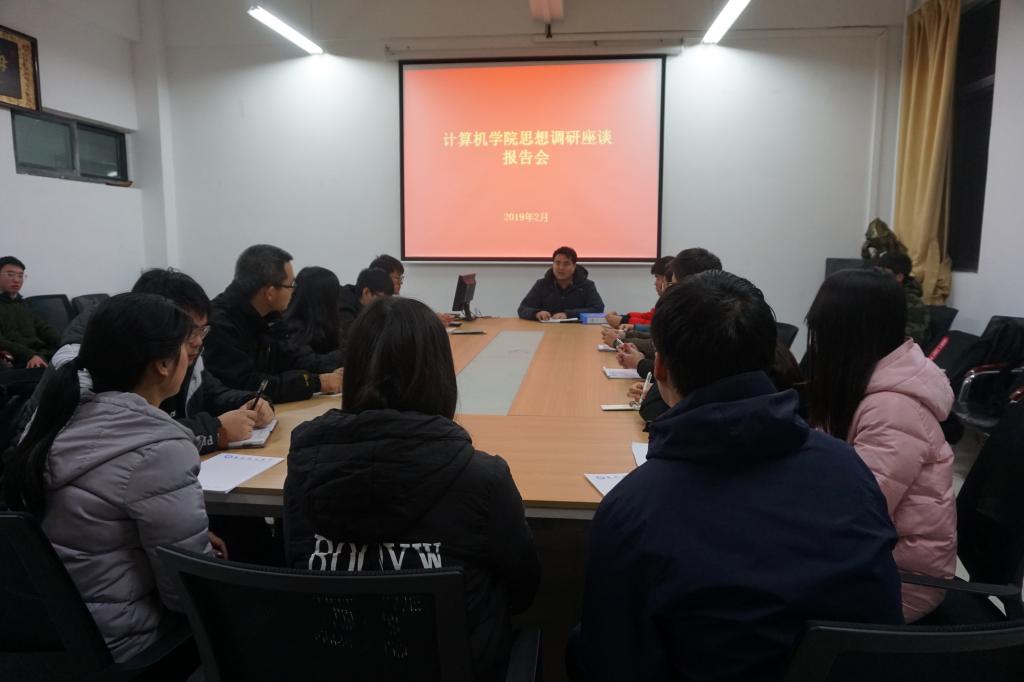 2019年2月26日晚7点,在计算机学院B403会议室,召开计算机学院春季新学期学生思想动态调研座谈会。本次座谈会由三个年级、不同专业,包括学生会成员、社团成员、学生班委及普通同学共20余人参加。