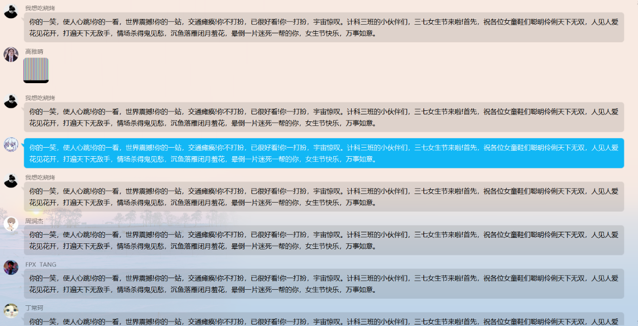 本次活动面向我院全体女生,设置有三项内容,分别是“班级祝福”、“趣味游戏”和“才艺大比拼”,班级间通过男生拍摄祝福视频、进行趣味游戏等方式增进男女生之间的情谊与交流,增加班级之间的凝聚力。从活动组织来看,广大同学积极参与,热情高涨,纷纷表示感受到了此次线上“女生节”的独特魅力。