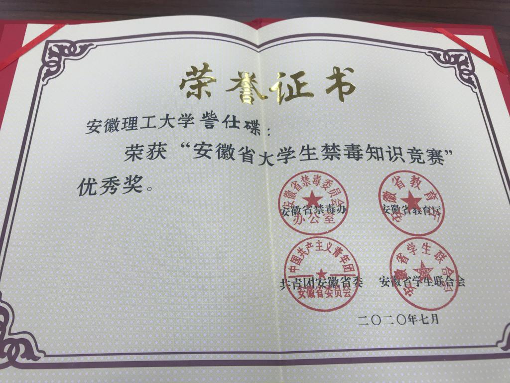 本次竞赛以线上答题的形式进行,围绕毒品种类、当前毒情形势、毒品的危害、毒品犯罪、如何预防毒品等禁毒知识点进行竞赛。同时,各团支部还通过主题班会、班级群、禁毒宣传视频等途径向学生宣传毒品和吸毒的危害。经过线上决赛,计算机科学与技术19-4班訾仕碟和软件工程19-1班刘帅获得安徽省大学生禁毒知识竞赛优秀奖。