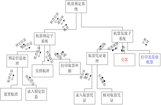 航空公司为给旅客乘机提供方便,需开发一个机票预定系统。各旅行社把预定机票的旅客信息(姓名、性别、工作单位、身份证号码、旅行时间、旅行目的地等)输入到该系统,系统为旅客安排航班。当旅客交付了预定金后,系统印出取票通知和帐单给旅客,旅客在飞机起飞的前一天凭取票通知和帐单交款取票,系统核对无误即印出机票给旅客。此外航空公司为随时掌握各航向飞机的乘载情况,需定期进行查询统计,以便适当调整。