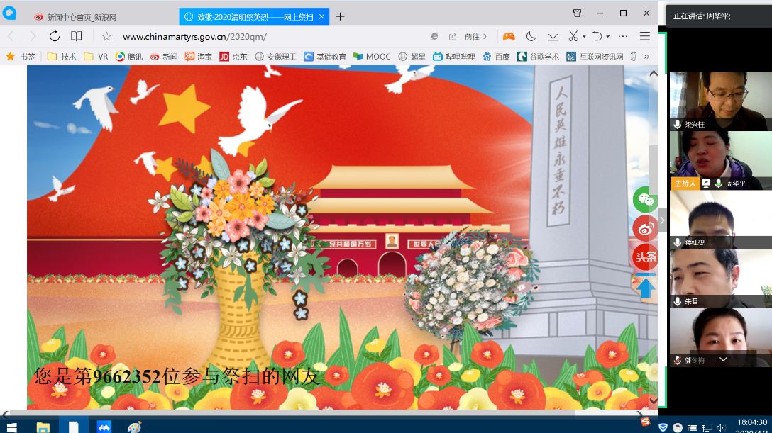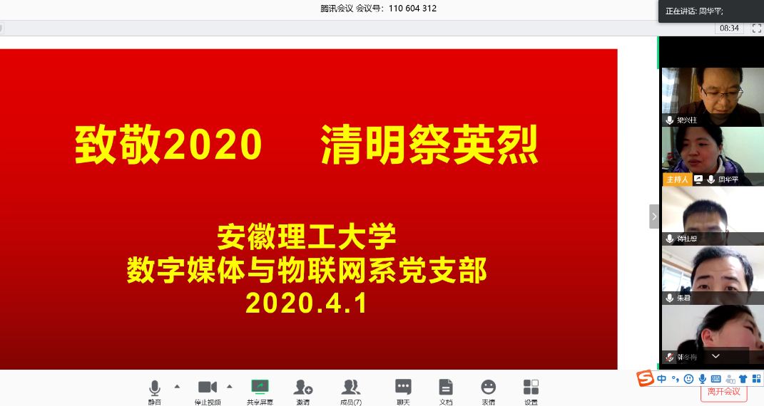 今年是中国人民抗日战争暨世界反法西斯战争胜利75周年,是中国人民志愿军抗美援朝作战70周年,为积极营造缅怀先烈、崇尚英烈、学习英烈的浓厚氛围,响应学院党委的工作要求,在清明节到来之际,4月1日,数字媒体与物联网系党支部的7名党员在网上开展了祭奠英烈活动。