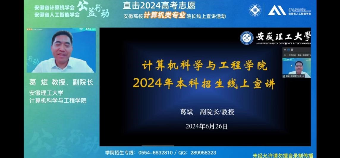 6月26日上午,计算机科学与工程学院受邀参加由安徽省计算机学会、安徽省人工智能学会共同主办的“直击2024高考志愿——安徽高校计算机类专业院长线上宣讲活动”,采取云端宣讲的模式助力专业2024招生,线上与广大考生和家长交流互动,7000余名考生家长线上观看并积极互动,反响热烈。